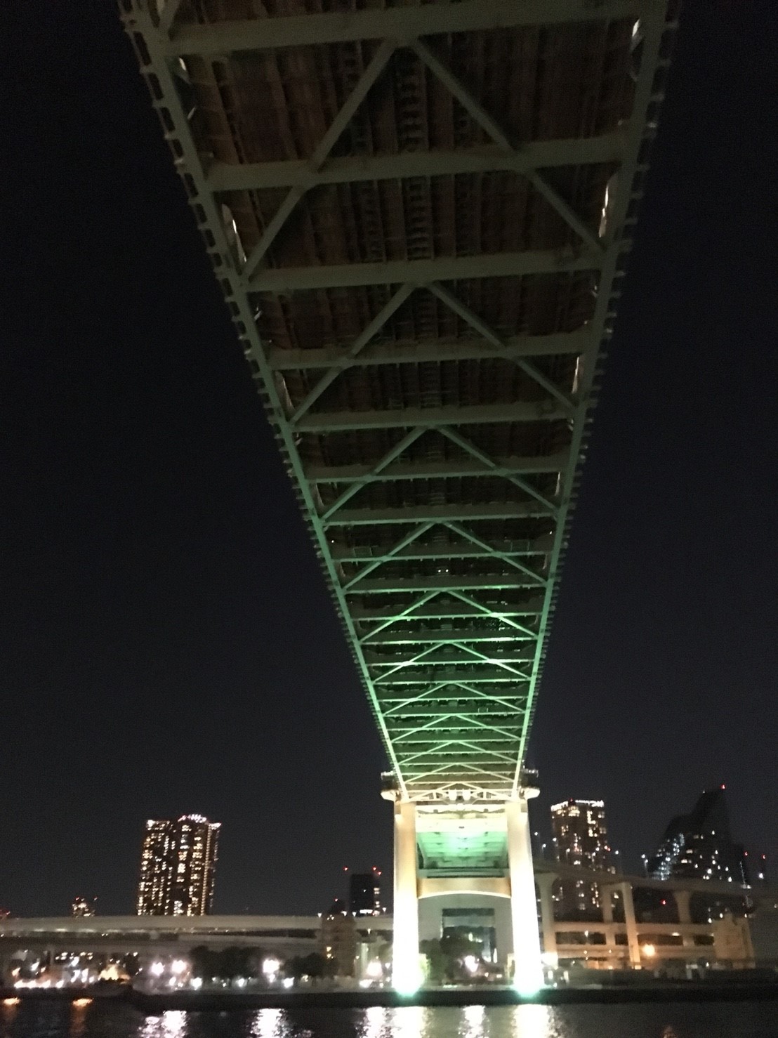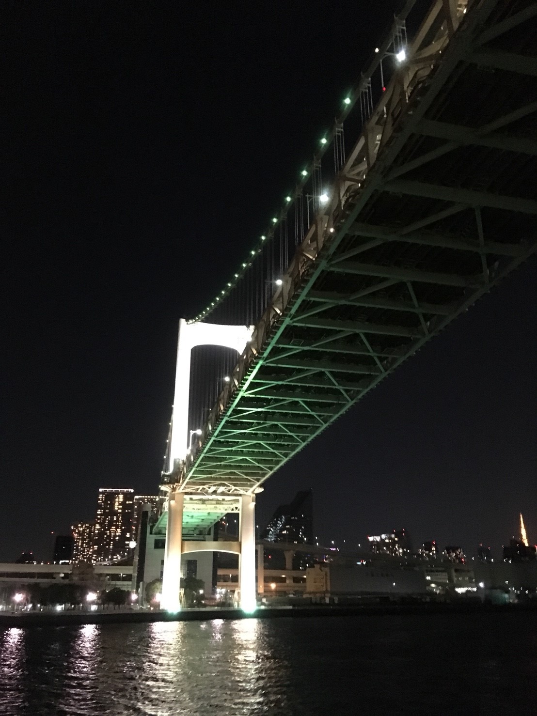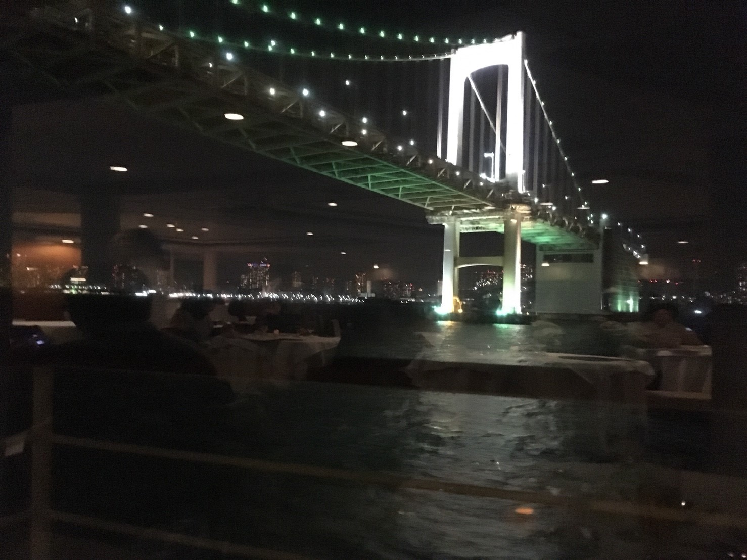 シンフォニーのディナークルーズは2つの橋をくぐるのですが、個人的にはレインボーブリッジよりゲートブリッジをくぐる時の方がよかったなあと思っていたんですが、再度帰りにレインボーブリッジをくぐる時はデッキから見ていたんですが本当に感動しました。