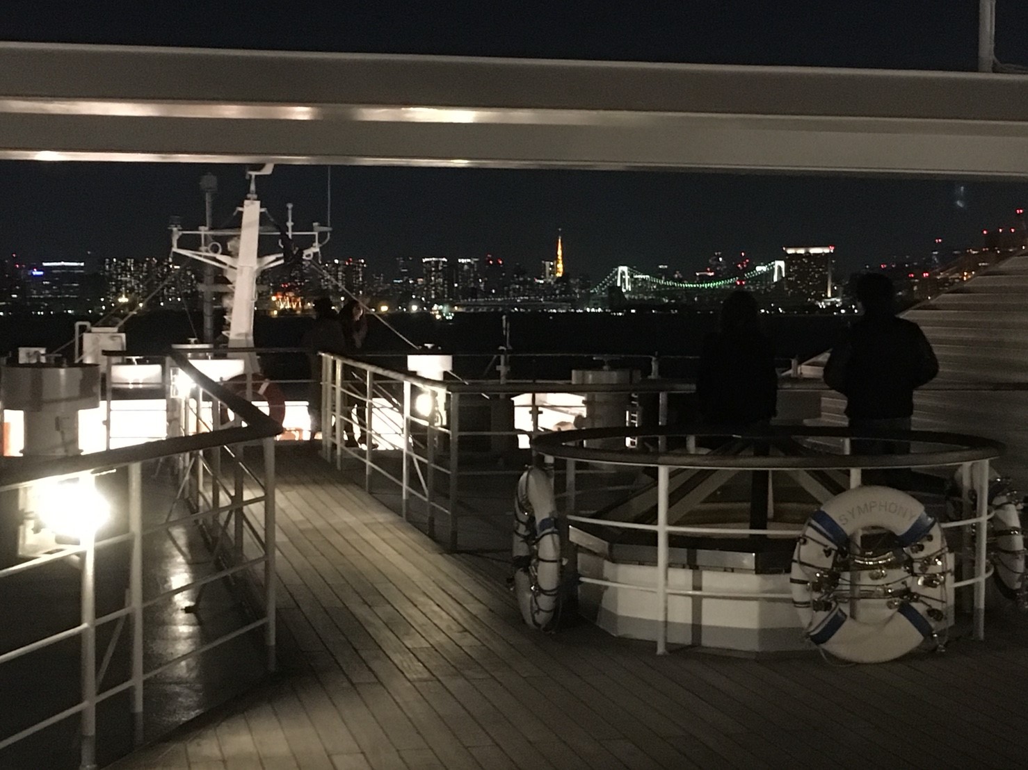 そのため、全然飽きませんでした。デッキに出ていると飛行機が真上を飛んでいったり、鳥が飛んでたり、近づく度に魅力を変えていく東京の夜景であったり、目に映るものが全て新しく一時も目が離せません。